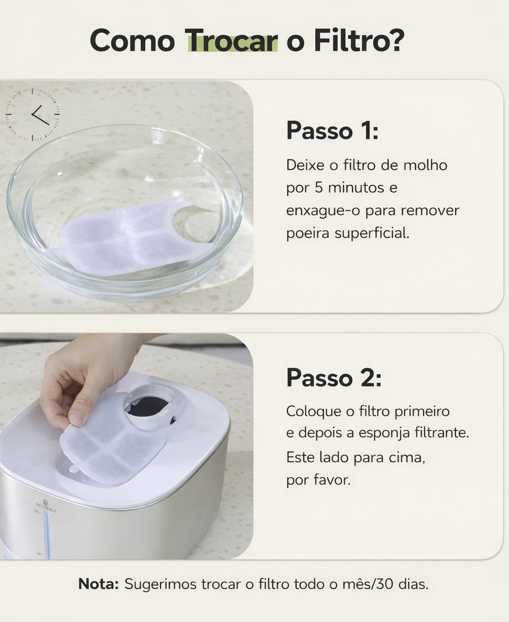Para garantir água sempre limpa e fluxo suave, siga as recomendações abaixo: